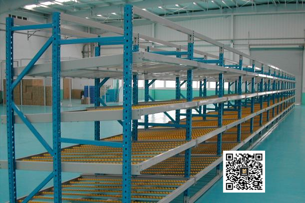 流利式货架采用辊轮式铝合金,钣金等流利条作为承载面,利用货物的自重与流利条的倾斜角度,实现货物的先进先出或先进后出。流利条货架适用于装配线两侧, 配送中心等场合所用。由于流利货架采用流利条作为承载面,所以在不能承载太重的东西。由于这种货架依靠货物的自重进行对货物的自动整理,所以也被称作为重 力式货架。