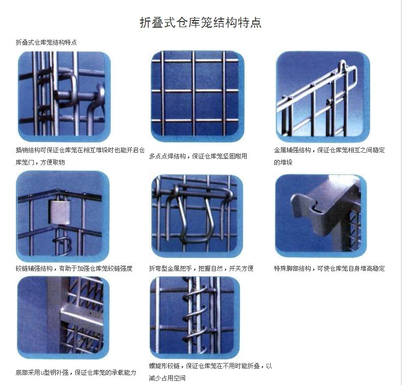 5:底部以U型槽钢焊接补强,使结构更坚固 仓储笼采用强力钢丝焊接而成,底部以U形焊接补强;具有可折叠,可安装万向轮