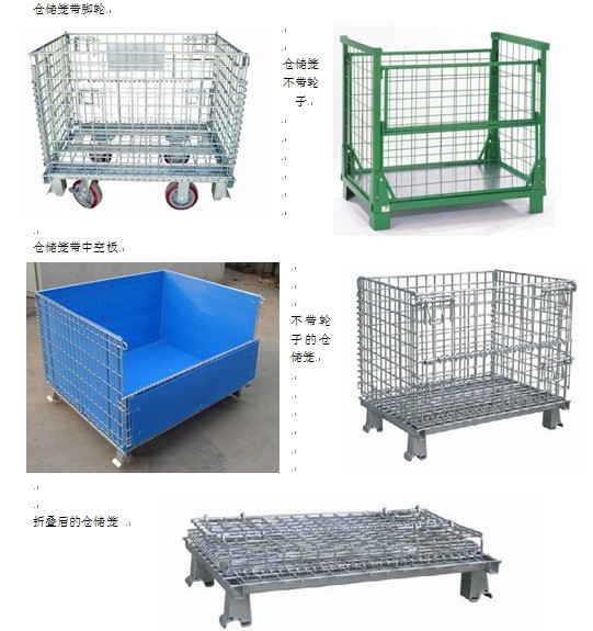 仓储笼采用强力钢丝焊接而成,底部以U形焊接补强;具有可折叠,可安装万向轮