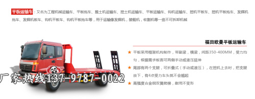五、福田时代挖机拖板车是专业拉6吨-12吨的挖机平板运输车。采用福田原装地盘,云内/玉柴130马力,带增压、方向助力,一排半宽体驾驶室,8.25-16轮胎,整车长度8米4,货厢长度为6米3(平面带斜坡和尾部)。