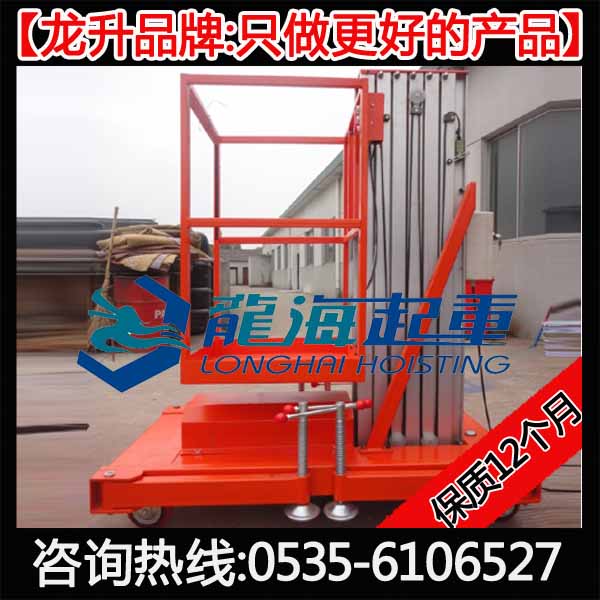 单桅高空作业平台(又叫单桅柱式高空作业平台)属于桅柱式铝合金升降平台(铝合金升降机),一种专业高空作业工具。龙海起重工具生产制造,“龙升”品牌,保质12个月!