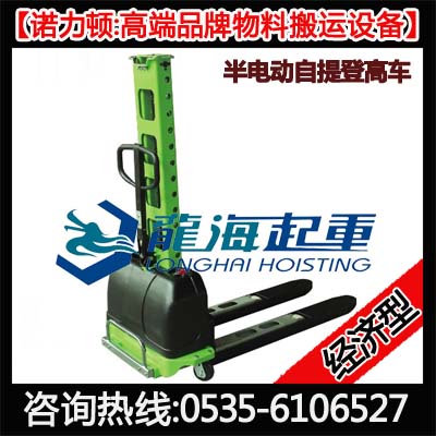 半电动自提登高车,又称自提式半电动登高车、蓄电池自提登高车,是烟台开发区龙海起重工具有限公司自主品牌“诺力顿”——高端品牌物料搬运设备。本产品属于经济型自提式半电动登高车,手动行走、电动升降,车身轻便易操作。