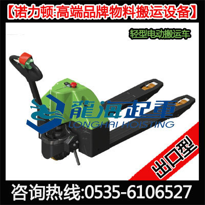轻型电动搬运车,又称全电动轻型搬运车、电动液压轻型搬运车,是烟台开发区龙海起重工具有限公司自主品牌“诺力顿”——高端品牌物料搬运设备。本产品属于出口型电动搬运车,适用于水泥地面或相对平整的地面,可爬坡。保质12个月。
