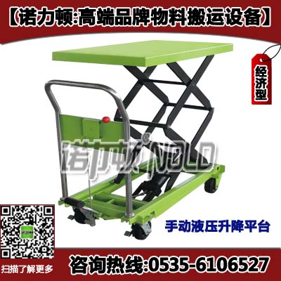手动液压升降平台又称液压手推平台车、液压平台车,是烟台开发区龙海起重工具有限公司自主品牌“诺力顿”。本产品属于经济型手动液压平台车,主要用于物品的起升、定位、装载、卸载、搬运货物或者作业中需要高度调节,它也是轻工业理想的搬运工具。保质一年。现货供应。