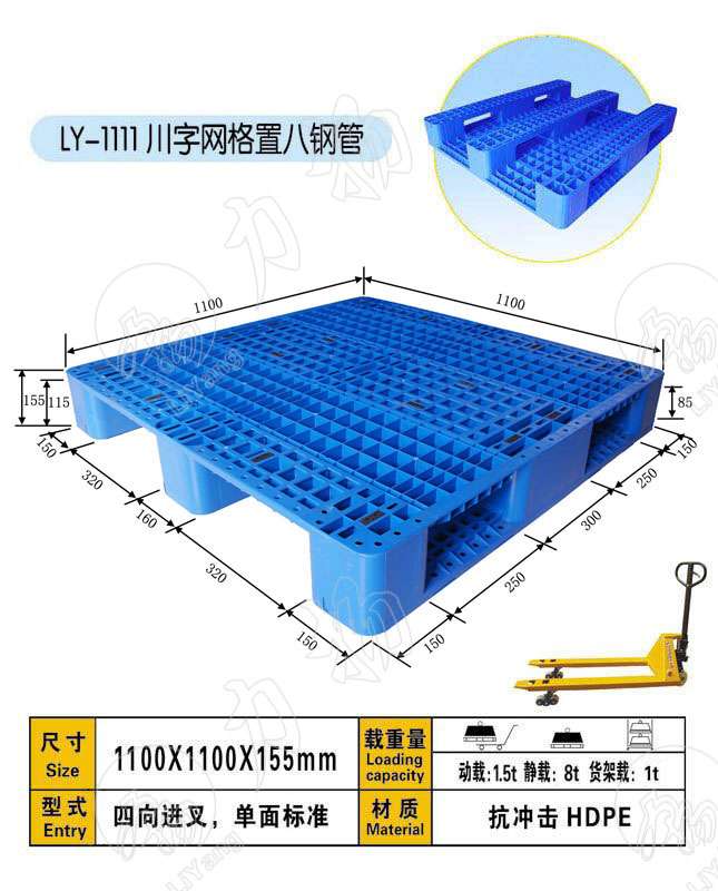 北京塑料托盘厂生产的塑料托盘的规格主要有:塑料托盘厂LY1412SM双面焊接 1400*1200*150 塑料托盘厂LY1515SM双面焊接 1500*1500*150 塑料托盘厂LY1010SM双面网格 1000*1000*150 塑料托盘厂LY1111SM双面网格 1100*1100*150 塑料托盘厂LY1311SM双面网格 1300*1100*150 塑料托盘厂LY1210SM双面网格 1200*1000*150 塑料托盘厂LY1412SM双面网格 1400*1200*150 塑料托盘厂LY1212SM双面网格 1200*1200150 塑料托盘厂LY1210DM川字网格1200*1000*160 塑料托盘厂LY1010DM川字网格1000*1000*160 塑料托盘厂LY1008DM川字网格1000*800*160