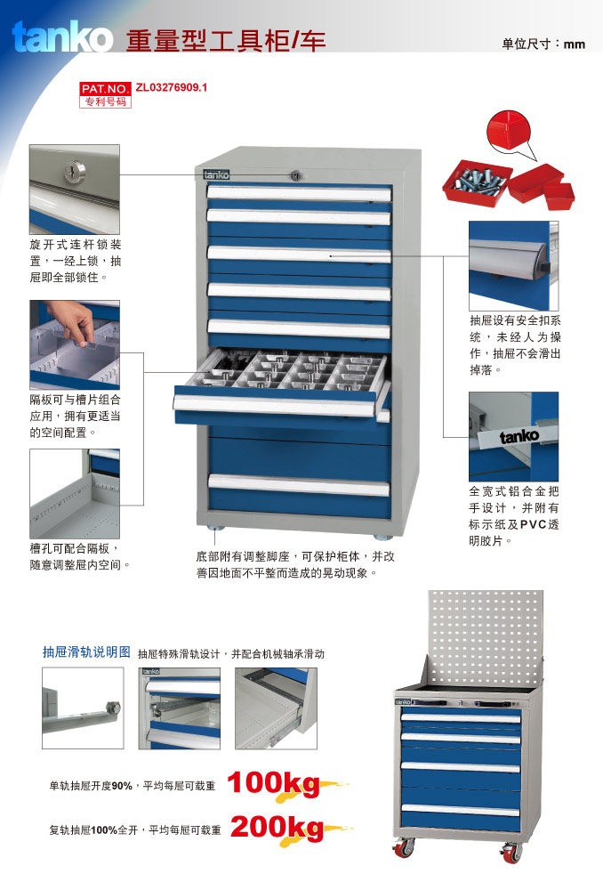 ?抽屉特殊滑轨设计,并配合轴承滑动、单轨抽屉开度90%,每屉荷重100KG,复轨抽屉100%全开,每屉荷重200KG。