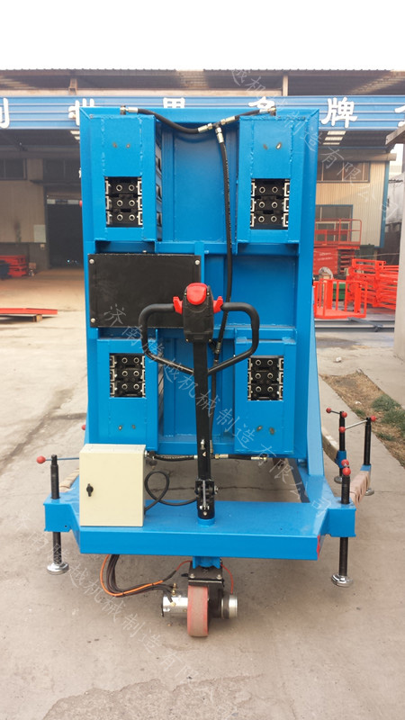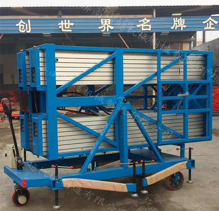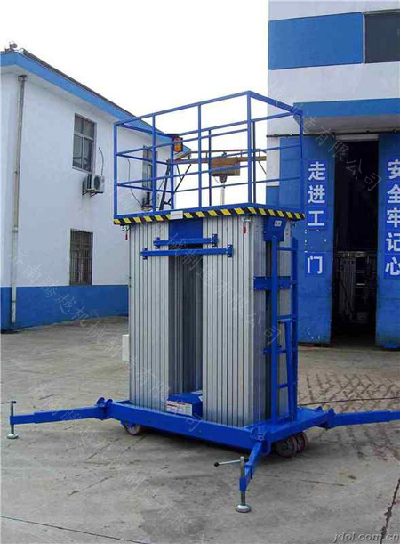 铝合金式:整体采用高强度铝型材精制而成由于型材强度高,具有造型美观、体积小、重量轻、结构紧凑、移动方便、升降平台平稳、操作方便、安全可靠等优点,令高空作业更方便快捷,能够快速、慢速行走,可调速,是现代企业高效安全生产之理想高空作业设备。自行式铝合金升降平台可分为单立柱铝合金,双立柱铝合金,三立柱和四立柱铝合金。广泛用于工厂、自动仓库、停车场、市政、车站、机场、影剧院、展览馆、码头、建筑、装修、物流、电力、交通,石油、化工、酒店、体育馆、工矿、企业等的高空作业及维修。是保养机具、油漆装修、调换灯具、电器、清洁保养等用途的最佳选择。升降平台升降系统,是靠液压驱动,也被称作液压升降平台。
