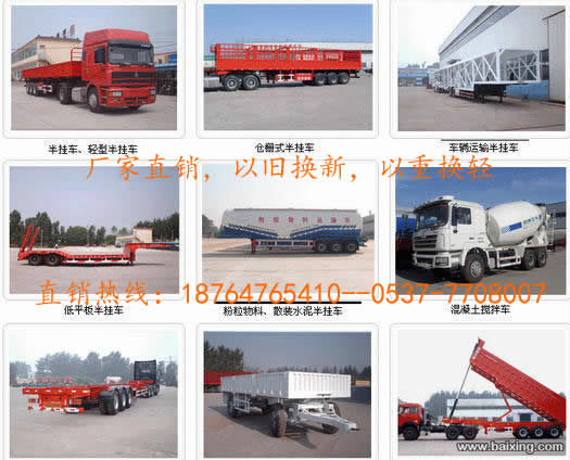 式半挂车 、自卸式半挂汽车 、运油半挂车 、轻型半挂车、 车辆运输半挂车 、粉粒物料运输半挂车、 化工液体运输半挂车、 重型低平板半挂车、 栏板式半挂车、 鹅颈式半挂车、 骨架式集装箱半挂车 17.5米低平板半挂车、 散装水泥罐车 特种半挂车半挂车以旧换新详细介绍 对于需要挂车以旧换新的客户我公司推出以下几种方式: 1、对于将自己的旧半挂车全部卖给我们的客户我们将他的旧挂折合成人民币兑换我们的新半挂车的价格,客户只需交上差价就可以,至于客户旧挂的价格要依据客户的挂车新旧程度及重量。 2、对于客户的旧半挂车客户还想使用自己的车桥与轮胎时,我们将客户的桥以上收回来收回的方式与第一种方式一样,然后用客户的车桥与轮胎按客户的要求做一台新半挂车,客户只需补交一次差价。 针对客户的不同要求进行不同的兑换方式直到客户满意为止,客户的满意是我们最大的效益来公司看车订车记得提前联系,真正确保厂家直销,请把电话存在手机上或者登记在笔记本上以便以后方便联系! 我公司任何车站没设接待站,望客户前来考察订车时电话预约;避免上当受骗。