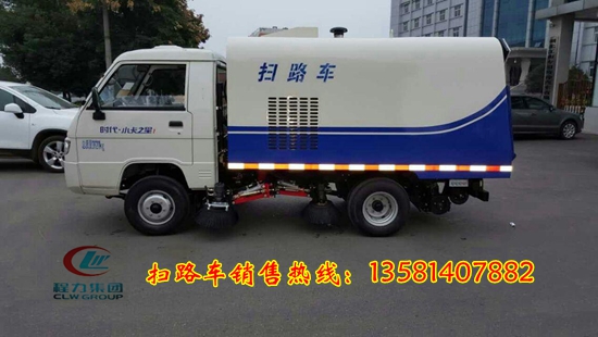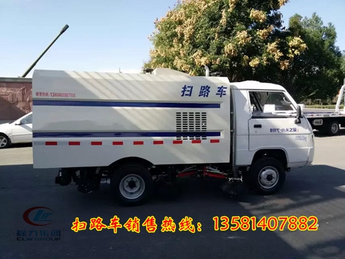该扫路车采用福田小卡型国四底盘改装,加装副发动机、风机、清水箱、垃圾箱、左右立扫、后置吸盘,扫盘降尘系统,液压系统、专用装置电控系统和副车架等改装而成