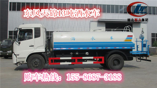 5、10-13吨东风天锦洒水车,白色前翻豪华驾驶室,4700mm轴距,6档变速箱,发动机为康明斯185马力,9.00-20轮胎