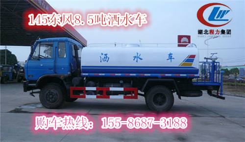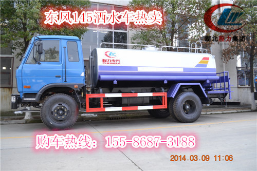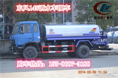 4、10-12吨东风145洒水车,蓝色前翻驾驶室,3950mm轴距,6档变速箱,发动机为康明斯170马力或玉柴140马力,9.00-20轮胎