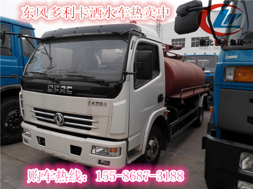 3、5.7-9.2吨东风多利卡洒水车,白色前翻驾驶室,3800mm轴距,5档变速箱,发动机为朝柴120马力,7.50R16钢丝胎,带增压