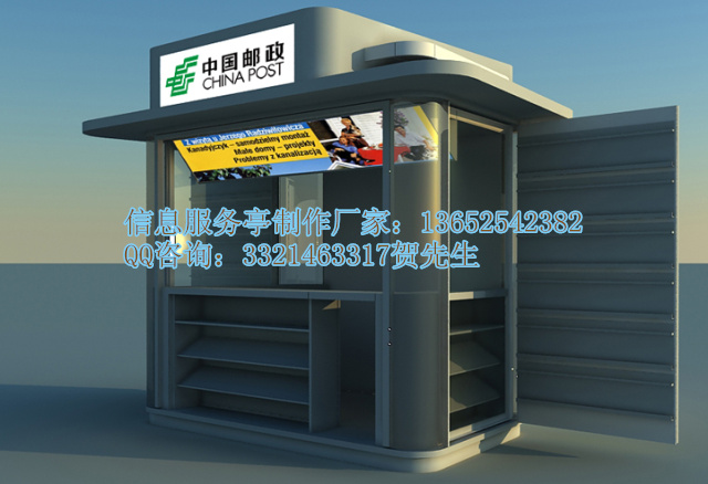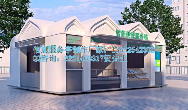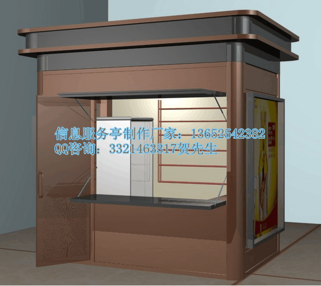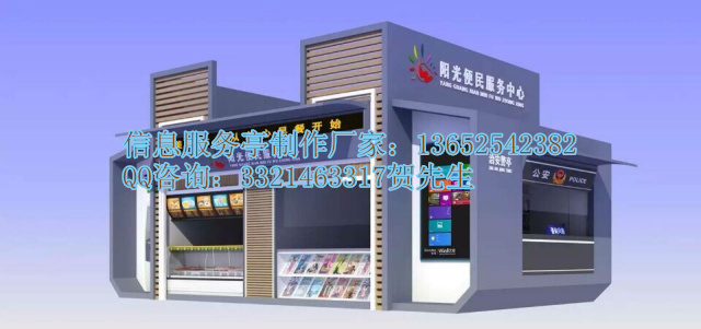 专业生产制作智能信息亭,设计定做信息服务亭热线:136-5254-2382贺先生QQ;332-146-3317信息亭终端实质上是一台具有触摸屏、特制键盘、安全监控及其它专用配件的高性能计算机,其操作简单,适合公众使用,而且机械和电气部件都经过专门设计,适合在恶劣环境下运行