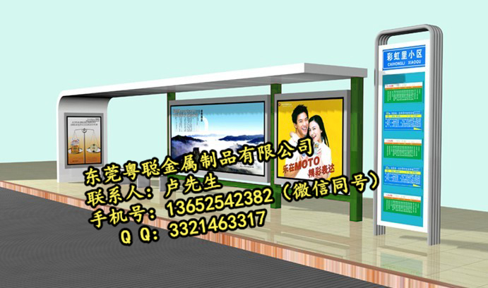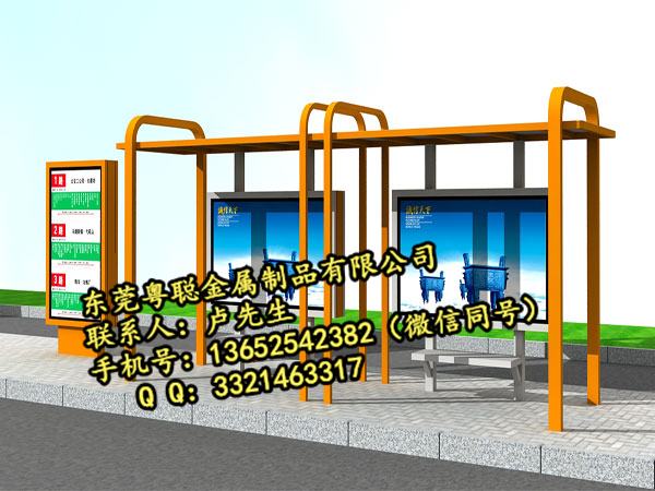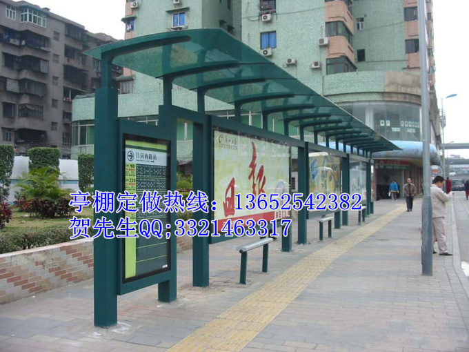 公交候车亭上其他主要辅助材料还有PC耐力板,用在灯箱两面,就是广告画面外面透明的那层板;云南候车亭批量特卖,铝塑板,用在顶棚的下面,就是抬头看到的那部分;镀锌板,一般用在顶棚上面和灯箱的主框。