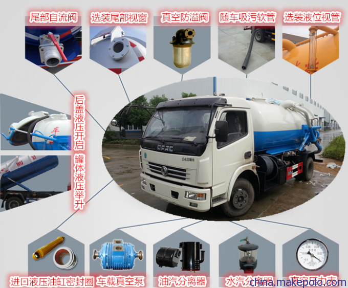 2东风天锦吸粪车(罐体容积8000--10000L)采用东风原装二汽底盘,具有安全性能高、动力强劲、噪音小、底盘强度高耐用等优点,发动机采用东风原装康明斯170马力柴油发动机,9.00-20轮胎,带方向助力,带空调,断汽刹,