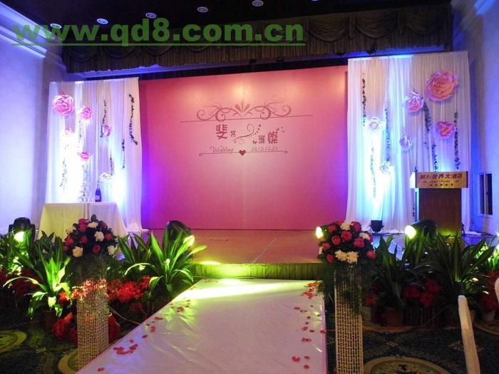 舞台背景,般套系都是纱幔布置家鲜花点缀,当然还有LED闪烁布置,另外可以根据新人的喜好选择是wedding牌或者是用新人照片,其中新人照片最近比较受欢迎,至于照片还是放到展示区这种宾客更容易看到的地方.背景的颜色,希望用白加粉的颜色,大量使用纱幔,制造那种浪漫和梦幻的感觉,而且这样人物站在舞台上因为颜色比较明快,可能拍照什么的效果都会好一些,不会非常的暗.
