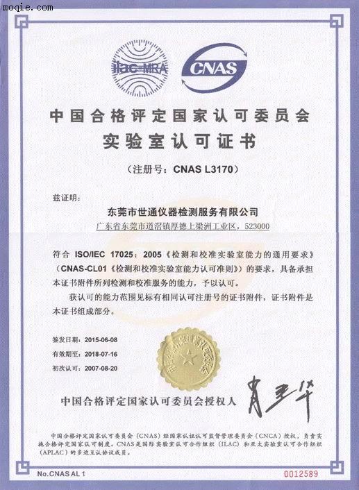 世通仪器检测校准中心(华南仪器校准中心)是经国家认可委员会认可(认可号L3170),国际实验室互认组织(ILAC-MRA)授权,通过ISO17025国际计量准则的具有独立专业从事仪器校正.仪器校验.仪器校准.仪器检测.仪器计量.仪器外校.第三方权威认证机构.CNAS认证及咨询培训的值得信赖的第三方公正实验室.本公司校准检测中心设有:力学、长度、几何量、衡器、电磁学及无线电室、热工等专业校准实验室.本校准中心可对以上类别范围的各国仪器进行校准并出具国际认可的的法定校准证书.校准/检测报告具有权威性、可靠性、公正性. 广东惠州市惠阳区试验机校准第三方检测认证公司