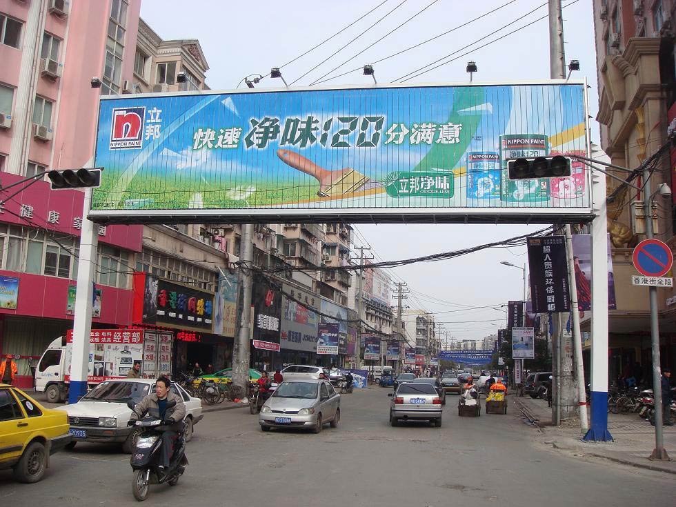 跨街广告牌是一种街头广告,一般在繁华街头使用,有很强的展现,广告效益很大。能够提升企业形象,提高品牌价值。跨街广告牌一般可分为全跨式跨街牌、半跨式跨街等。跨街广告牌制作中常用到的材质有,钢立柱、钢管、不锈钢管、led/荧光灯光源、钢化玻璃、石材、户外灯箱材料布等。