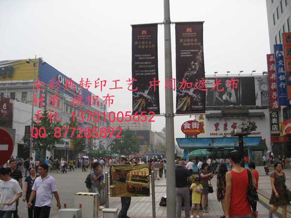 公司所制作的灯杆旗效果与北京奥运会标识旗的工艺、布料、后期加工完全一样。可以印制渐变色(又称过渡色)色彩艳丽。双面透效果。直接喷印加热后,实现完美的双面透效果,正面和背面色差不大。